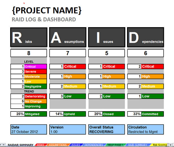 Project Risk And Issue Log Template : Project Risk And Issue Log Template - Number of severe ... : Can i use issue log template in my project management tasks?. Maintaining a risk log and issue log enables project managers to view progress and make sure all risk are captured. In this article, we will be looking at what is a risk and issue log and the purpose of in project management the issue log is utilized to file problems, evaluate their effect on the project and build measures that can be brought to eliminate. Comprehensive raids log (risk, action, issue, opportunity, lessons learned, dependency, supplier costs, expense costs and change request tabs) and accompanying charts. Issues can be thought of as risks that have materialised. Now appoint the tasks and activities in a manner so that you can deal with risks of the projects through getting this template as it holds the following features:
